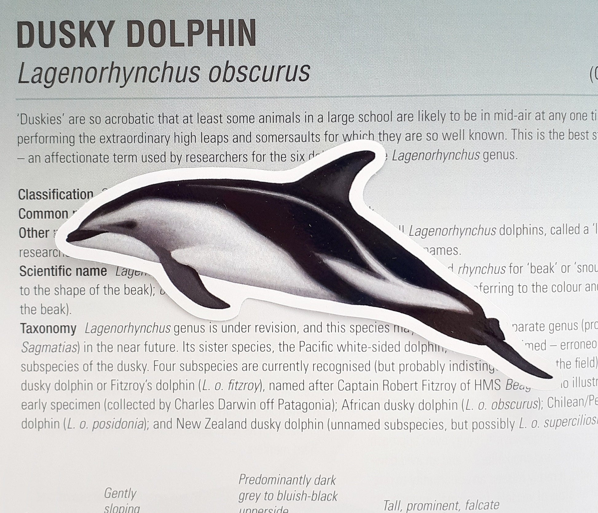 Dusky Dolphin Vinyl Sticker. Sticker is approx 10.5 cm x 4.5 cm. Perfect for laptops, sketchbooks, or as a small bumper sticker.